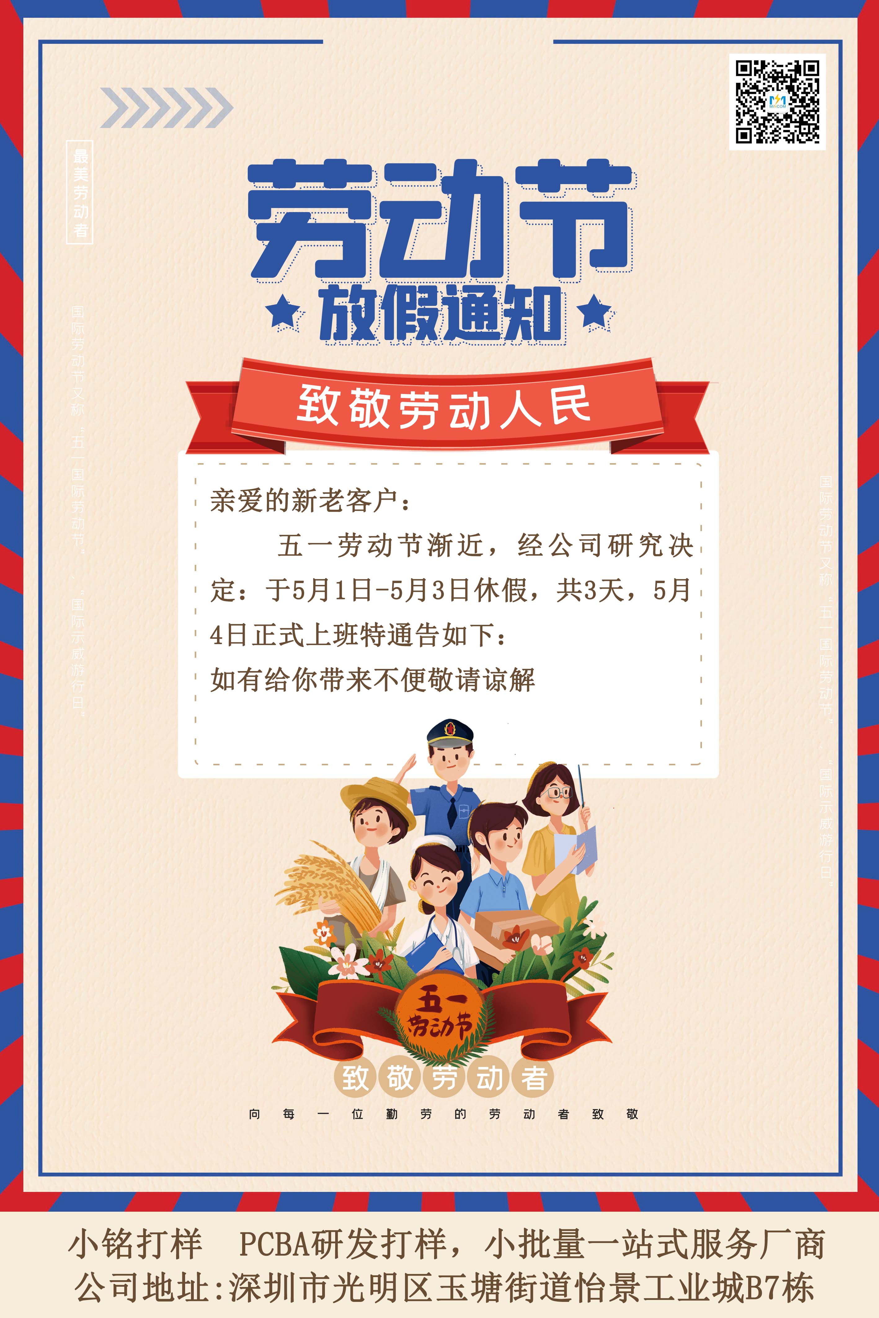 小銘打樣PCBA 五一放假通知,親愛的新老客戶: 五一勞動(dòng)節(jié)漸近,經(jīng)公司研究決定:于5月1日-5月3日休假,共3天,5月4日正式上班; 特此通告: 如有不便 敬請諒解!